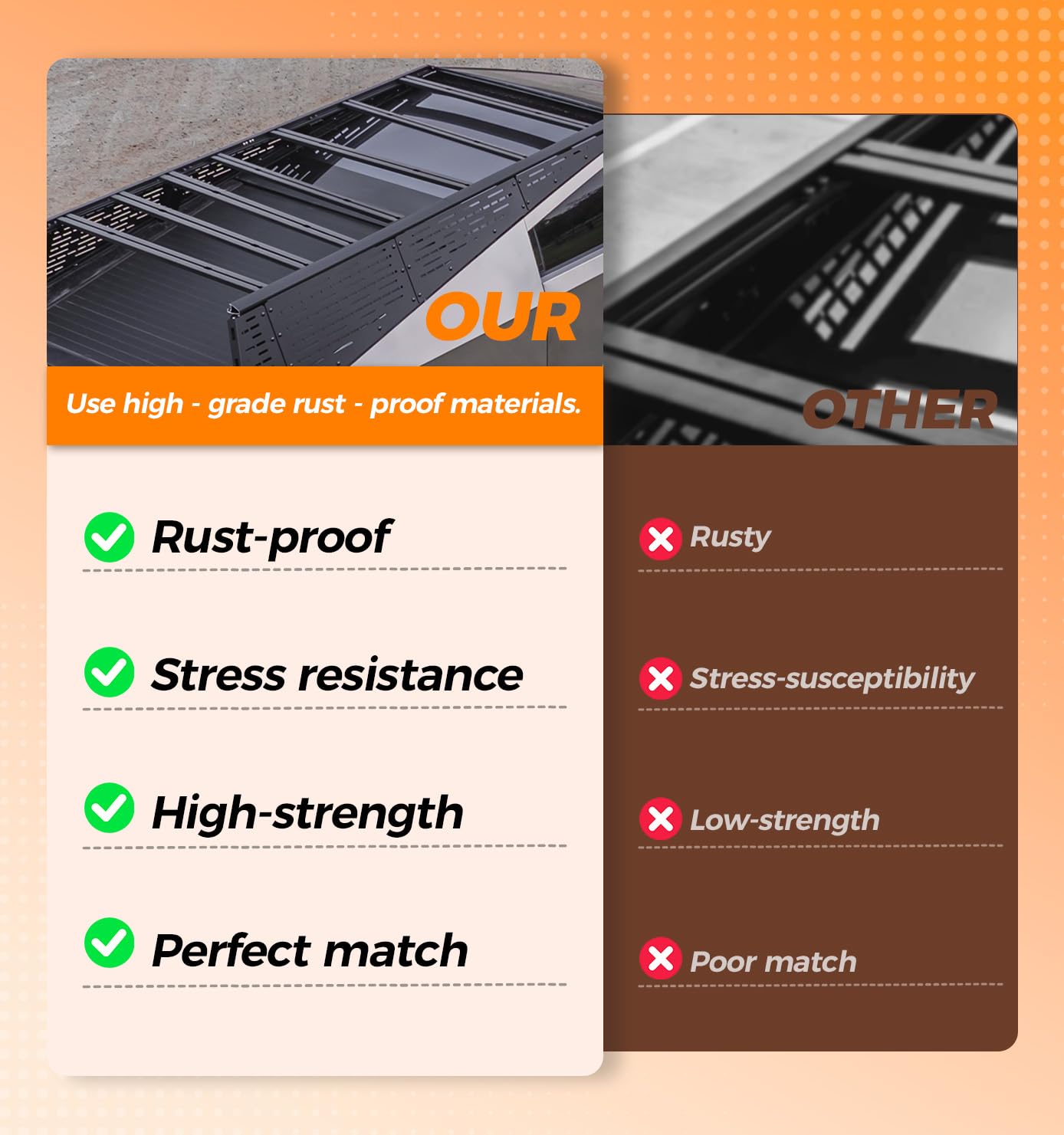 • Custom Design: Our cargo racks for roof have gone through multiple iterations to improve the fitment and integrate seamlessly with your Cybertruck, allowing for top, side and bottom gear carrying, with 7 adjustable crossbars and 2 Molle panels.